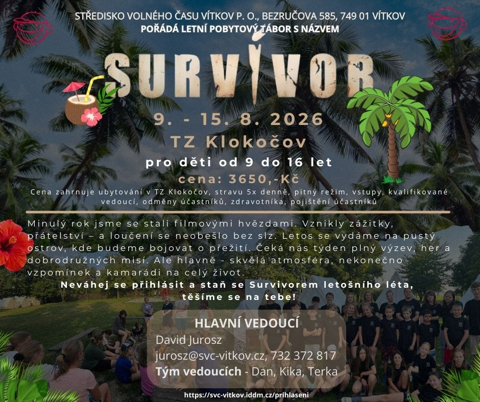 Ubytování v TZ Klokočov, 5x denně strava, vstupy, kvalifikovaní vedoucí, odměny účastníků