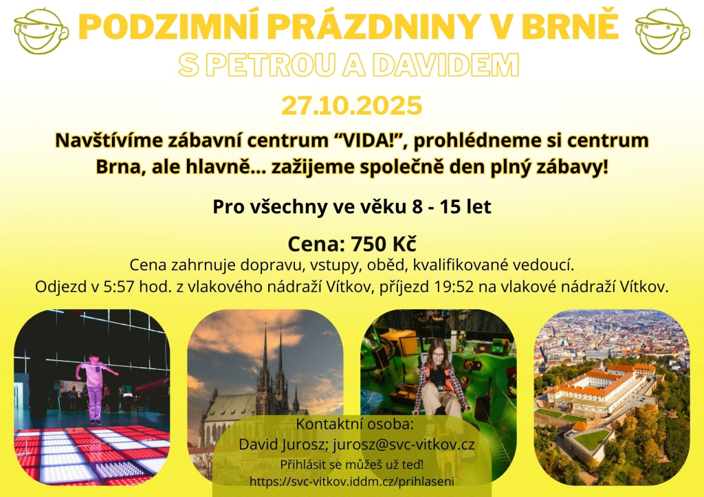 Navštívíme zábavní centrum “VIDA!”, prohlédneme si centrum Brna, ale hlavně... zažijeme společně den plný zábavy!