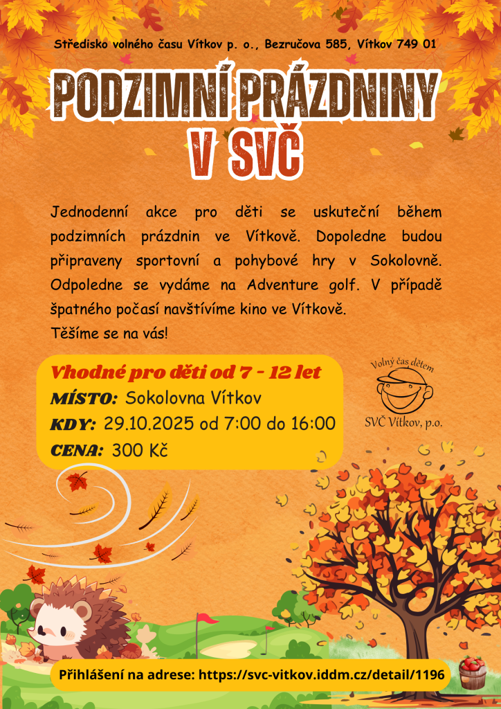Jednodenní akce pro děti se uskuteční během podzimních prázdnin ve Vítkově. Dopoledne budou připraveny sportovní a pohybové hry. Odpoledne se vydáme na Adventure golf, v případě špatného počasí navštívíme kino ve Vítkově.Těšíme se na vás!