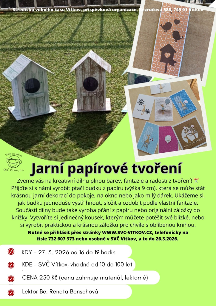 Zveme vás na kreativní dílnu plnou barev, fantazie a radosti z tvoření! ✂️ Přijďte si s námi vyrobit ptačí budku z papíru (výška 9 cm), která se může stát krásnou jarní dekorací do pokoje, na okno nebo jako milý dárek. Ukážeme si, jak budku jednoduše vystřihnout, složit a ozdobit podle vlastní fantazie. Součástí dílny bude také výroba přání z papíru nebo originální záložky do knížky. Vytvoříte si jedinečný kousek, kterým můžete potěšit své blízké, nebo si vyrobit praktickou a krásnou záložku pro chvíle s oblíbenou knihou.