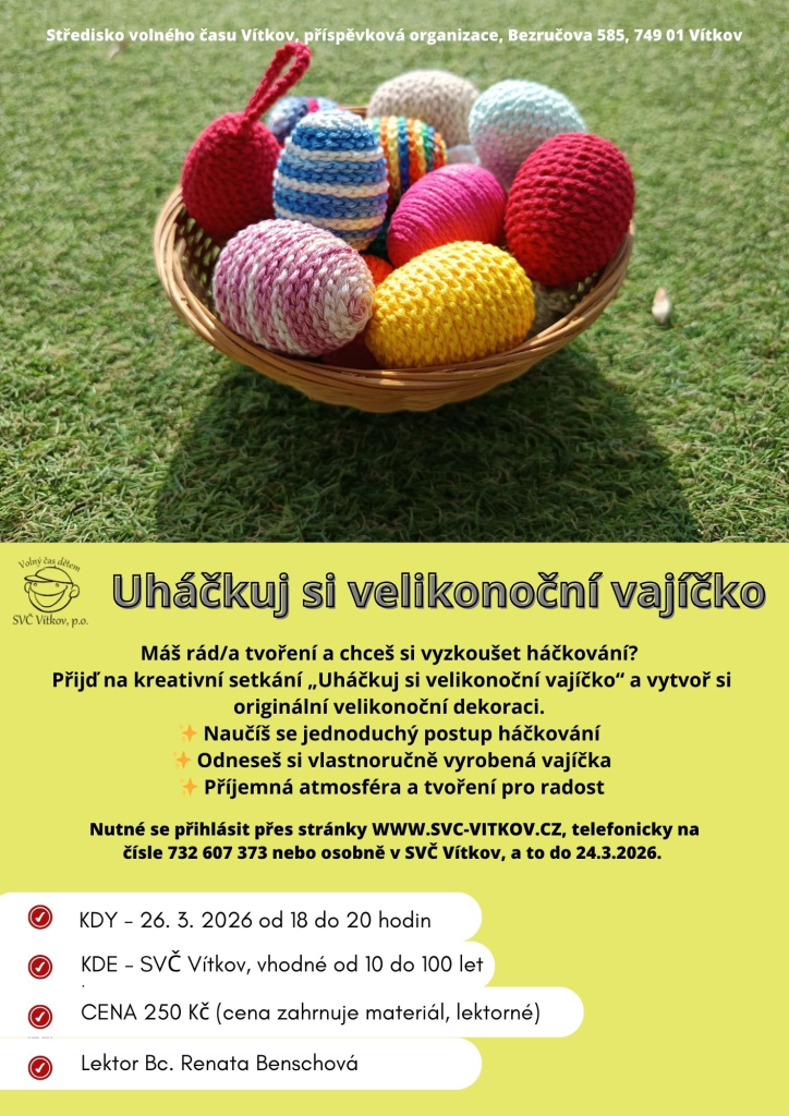 Máš rád/a tvoření a chceš si vyzkoušet háčkování?Přijď na kreativní setkání „Uháčkuj si velikonoční vajíčko“ a vytvoř si originální velikonoční dekoraci.